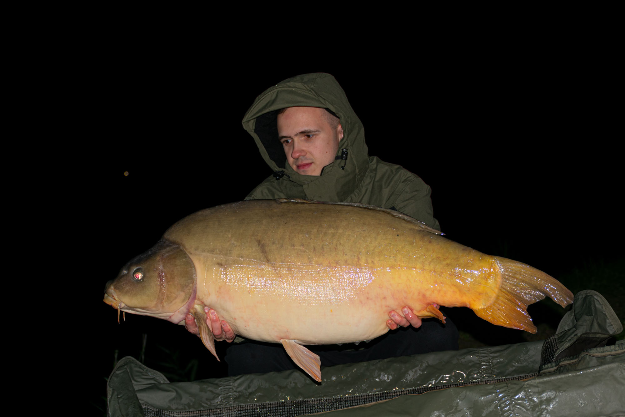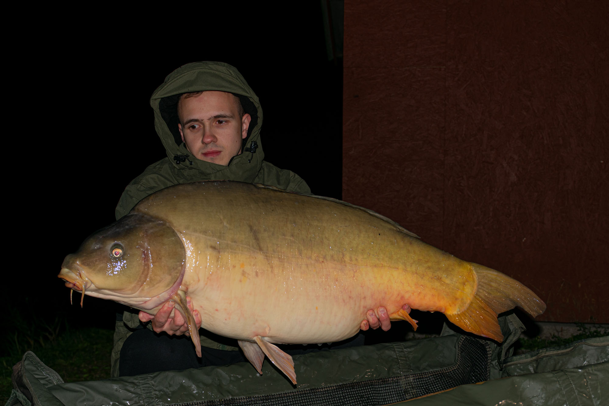 11 óra környékén lepihentünk, majd fél 12-kor, 45 méterről, húzós kapással jelentkezett a tó egyik gyönyörű lakója. Pár perces fárasztást követően viszonylag könnyedén sikerült a bölcsőbe fektetni, és egy-két fotóra bírni. Egy teljesen egészséges, jó formában lévő 17,80 kg-os, gyönyörű bőrponty volt az „áldozat”, aki nem tudott ellenállni az SBS finomságainak. Azonosítás és nyomon követes céljából minden 11 kg feletti halat chippelnek, és halőri hitelesítést követően lehet csak a tóba visszaengedni.