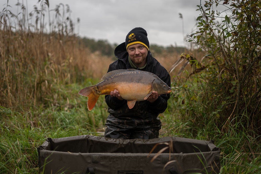 Drehender Wind und strömender Regen verdorben unseren Plan, morgens mit Flori und Felix ein Feeder-Video zu drehen und die Bisse blieben auch aus. Das wird nachgeholt! Felix hatte uns allen früh ein fettes Frühstück zubereitet und gut gesättigt packten wir langsam ein. Ich hatte durch die Schnurbögen, einige Fall-Piepser Nachts und wunderte mich am Morgen, warum nur meine linke Schnur komplett durchhing und die rechte nicht. Ich wollte eigentlich beide Ruten nochmal frisch machen, aber da nachdem ich die linke fertig hatte, wieder ein fetter Regenschauer rüberzog, ließ ich die rechte Rute liegen... Das Boot eingepackt und nur noch die Ruten lagen und wir begannen eine nach der anderen reinzuholen. Meine rechte Rute war fest... Mich überkam ein komisches Gefühl...also holten wir das Boot, Motor und Batterie wieder raus um einen Abriss vom Ufer zu vermeiden. Zirka 350m später kam mein Inline-Blei hoch und die Schlagschnur ging weiter ins Schilf. Meine Vermutung bestätigte sich als es im Schilf wackelte. Da hing tatsächlich ein Fisch dran. Und ohne große Schwierigkeiten kam der Fisch aus dem Schilf geschwommen und begann sich ordentlich zu wehren. Der starke Wind machte es mir garnicht so leicht den Fisch in den Kescher zu bekommen. Ich war auch zusätzlich noch sehr Vorsichtig, da ich den Fisch unbedingt landen wollte. Nach einigen Fluchten und Drehungen mit dem Boot, gelang es mir endlich. Selten habe ich mich soooo über einen Spiegler in dieser Größe gefreut wie hier. Und so bin ich mit dem Spiegler zurück ans Ufer um Otti´s neue Abhakmatte einzuweihen. Ein paar tolle und lustige Bilder sind dabei entstanden und wir waren mega happy.