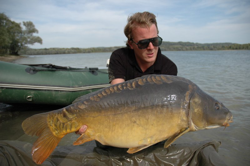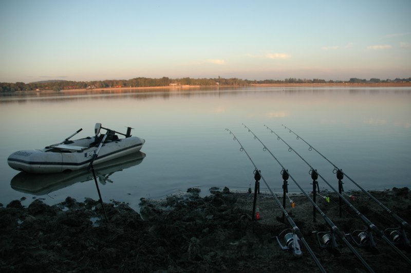 Da wir nun den ganzen Tag Zeit hatten, brauchten wir uns nicht zu beeilen die Ruten auszulegen. Alle Montagen wurden rausgerudert, um unsere zwei Batterien für eventuelle Drills zu schonen. Am frühen Nachmittag war es dann endlich so weit und alle Fallen waren gestellt. Wir machten es uns in unseren Zelten gemütlich und harrten der Dinge die da kommen sollten. Gegen 22:30 war es dann so weit, als sich meine Funkbox mit erst einem dann einem weiterem „Piep“ bei mir meldete. Beim Dritten saß ich bereits im Boot und sauste mit Vollgas dem Fisch entgegen. Nach einigen Minuten war ich auf Höhe des Fisches angelangt. Ich stellte den Motor ab und der eigentliche Drill konnte beginnen. Tief zog der Fisch seine Bahnen und ließ sich von meiner 2 ¾ Lbs Rute nicht sonderlich beeindrucken. Um mich war es totenstill, lediglich meine Tournament gab metallene Geräusche von sich. Nach und nach konnte ich den einen oder anderen Meter an Schnur gewinnen und im nächsten Moment wieder verlieren. Nach einiger Zeit schienen dem Karpfen seine Kräfte zu schwinden und er ließ sich Meter für Meter hoch pumpen. Noch eine letzte Flucht vor dem Kescher und der bullige Karpfen versank im Netz. Zurück am Platz wartete schon mein Freund Basti, um den ersten Karpfen des Trips zu begutachten. Die Reuben Heaton blieb bei 20,5Kg stehen – was ein Start!