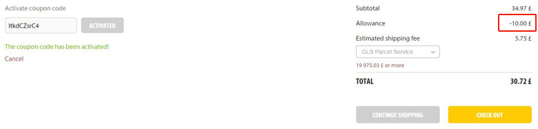 Después de haber seleccionado el(los) producto(s) que le gustaría comprar, diríjase por favor a la página de pago, introduzca el código del cupón en el campo "Código de descuento" y haga clic para activar. Una vez que haya activado el código de descuento el total de reflejará con el descuento aplicado.