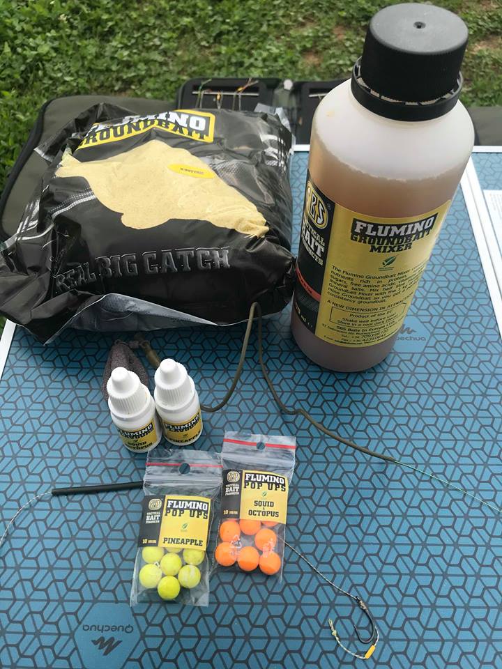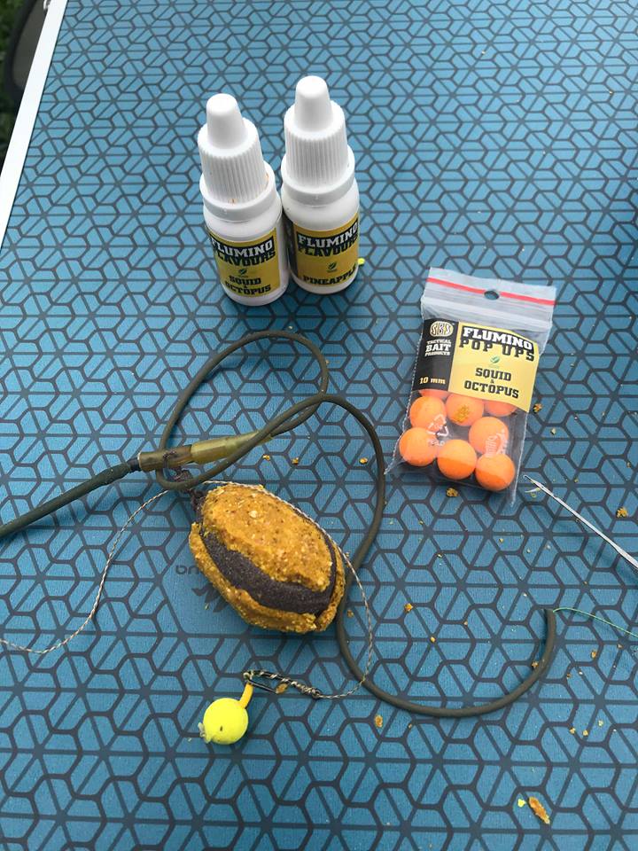 A másik botomat az SBS All In Flumino termékcsaládra bíztam. Az 1 kilogrammos Flumino Groundbait etetőanyag mixet a Groundbait Mixer folyadékkal N-Butyric ízben, összekevertem. Az így kapott etetőanyagot a pasztaólomra gyúrtam, és a horog végére került egy 10 mm-es, ananászos Flumino Pop Up. A szerelék vízbebocsátása előtt a horog csalira pár csepp Flavours aromát csepegtettem.