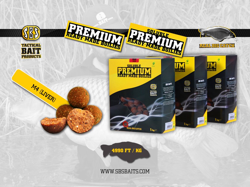 Évek óta kísérletezünk egy olyan májas jellegű ízvilágon, amely méltó tagja lehet a Premium széria "M" sorozatának. A fejlesztési munka nehézségeként éltük meg azt a tényt, hogy a legjobb összetevőkből álló alapmixhez nem találtunk olyan aromát, amely tökéletes, általunk megálmodott íz- és illatvilágot eredményez. Az SBS céggel közel 30 éve együttműködő, alapanyagokat forgalmazó angol partnerünktől olyan különleges májport sikerült beszereznünk, amelynek felhasználásával végre megszülettek az M4-es termékek. A bojlik különlegessége, hogy a májpor osztályon felüli minőségének köszönhetően ezek a csalik egyáltalán nem tartalmaznak aromát, ugyanakkor a hőkezelési eljárásnak köszönhetően mégis egy intenzív illatú, a halak számára vonzó termékcsaláddal vehetjük üldözőbe őket.