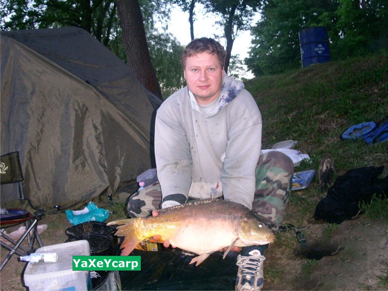 Ezután nyugalom költözött a vízre, még aludni is tudtam egy kicsit. A pirkadat után, újracsaliztam, majd végrehajtottam egy fontos műveletet, megreggeliztem, kávéztam. Ez a környezetemre nézve is fontos, hogy ne legyek nyűgös a reggeli órákban. Továbbra is csendesek voltak a kapásjelzők, már azon törtem a fejem, hogy elkezdek összepakolni, és indulok haza. 9 óra környékén az M1-el csalizott botomon megszólalt a kapásjelző, és a fék is ciripelt, de csak olyan öregesen lassan futott le a zsinór az orsóról. A bevágás után, ahogy pumpáltam ki a halat, éreztem, hogy nem átlagos méretű lesz, de nem nagyon tört ki oldalra, úgy gondoltam, hogy szebb amurt akasztottam. A part közelben, egy kicsit megindult, Attila cimborámmal már a vízben álltunk, és Ő meg is jegyezte már szákolás előtt: „Ez egyéni rekordod lesz!” Igaza is lett 12,5 kg-s tükröst fogtam, ráadásul jelölve is volt. Később kiderült, hogy ő a „Jegeske” névre elkeresztelt potyesz, és nagyon torkos, előttem egy nappal is horogra akadt, és azelőtt még egy héttel is megfogta a „keresztapja”. Persze, azért örültem neki. Amikor visszaengedtem a vízbe alig akart elúszni, pedig láthatóan nem viselte meg, a fárasztás.