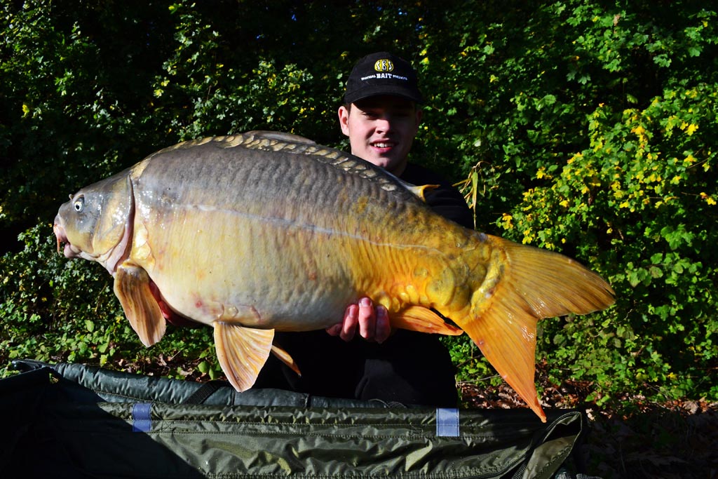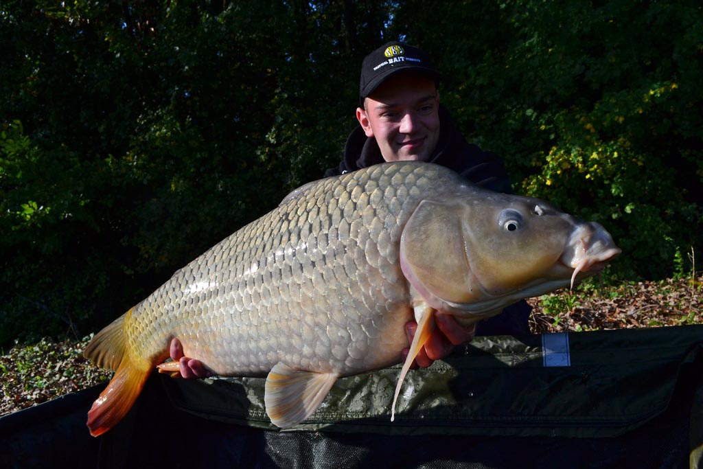 Az első két hallal elég magasra tettük a lécet, és ekkor még nem sejtettük, hogy ezt lehet „überelni”. Ráadásul, a következő két kapásomból egyik hal sem lett meg. Sajnos egy hibát követtem el azzal, hogy az oldalólmos szerelékemet nem fixre kötöttem, és a kapás után rögtön csúszóvá vált a szerelékem. Ez önmagában nem lenne hiba, csak a víz hőmérséklete már bőven 16°C alatt volt, és ennek köszönhetően a halak szája megkeményedik. Ebben az esetben már nem tudta belehúzni az ólom a hal szájába a horgot, mielőtt csúszóvá vált volna a szerelék. További fogások reményében cselekednem kellett, ezért gyorsan kötöttem egy fix szereléket. Míg én ezzel foglalatoskodtam, addig Patrik további két gyönyörű őszi pontyot csalt horogvégre a Green Crab-os bojlival, amit Ace Lobworm-os Spod Juice-ba áztatott.