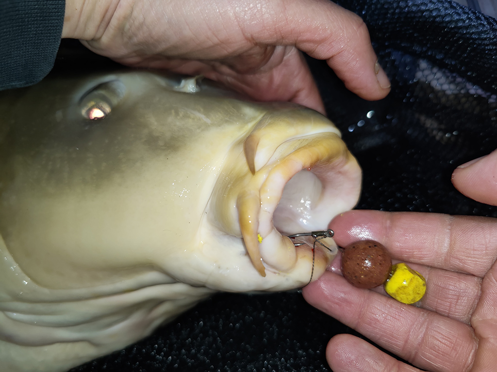 A csalizást a jól bevált módon végeztem. A horogra Premium Boilie Wafters M1, 20 mm-es, tovább könnyítve SBS Fluoro Pop Ups Pineapple csalival. A hóembert megfelelően kiegyensúlyoztam úgy, hogy a pop up-ot addig faragtam, amíg lassan a fenékre süllyedt wafters társával együtt. Ezután a hóembereket M1 Premium Bait Dip-be mártottam, majd bevontam őket oldódó M1 Premium Bomb Paste-tal. Ezt két botnál alkalmaztam. A harmadik botommal bag-es technikával próbálkoztam, váltogatva a horogcsalikat, pelleteket és PVA liquid-eket.