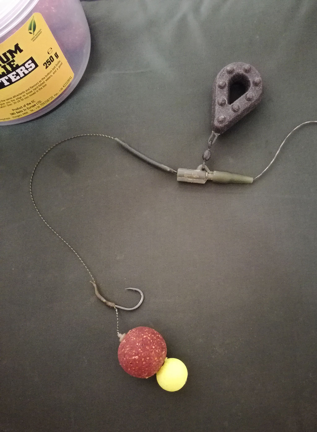 Végszereléknek egy egyszerű ólom elhagyós szereléket választottam, 15 cm hosszú, lágy, 25 lb-s PB Products horogelőkét kombinálva egy 4-es méretű SBS Grip-Tip horoggal. Csalinak a már sokat bizonyított hóember kombinációt használtam, amely egy szem 20 mm-es méretű M1-es Waftersből és egy 14-es ananászos pop upból állt.