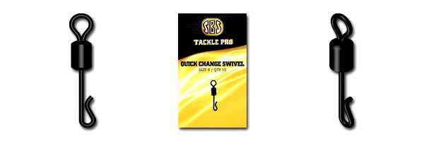Az Quick Change Swivel egy forgóval egybeépített gyorskapocs, amellyel pillanatok alatt végrehajtható az előkecsere. A forgókapocs egy megszokott és egy lezáratlan, horog alakú szemmel rendelkezik. Az előkehurkot a lezáratlan szemre az előke felől ráhúzott gumi hüvellyel (Anti Tangle Sleeves) rögzíthetjük.