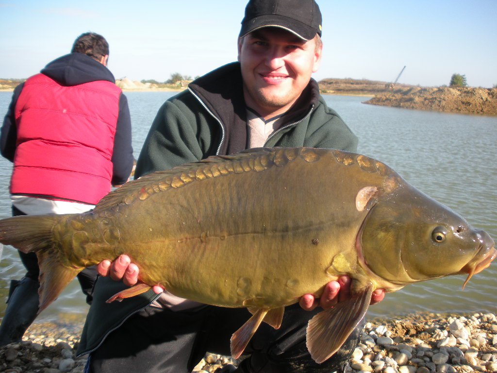 Legtöbbet az M1-es etetéssel bíbelődtünk, mert a horgászhelyünktől 200-220 méterre volt. Első kapásunk 13:00 kor volt az eperkrémes bojlival etetett bóján. Egy hibátlan tőpontyot merítettünk 5400 gr-os súllyal. 14:00-kor a szilvás etetésen is jelentkező volt. Balázzsal mindketten a vízen voltunk a csónakkal, mert az egyik bójánk beázott és gyorsan meg kellett javítanunk. Már a vízen hallottuk a jelző folyamatos sípolását! 1 perc alatt kiértünk, de így is vagy 50 méter damilt lehúzott a hal. Balázs akasztott, 15 perces intenzív fárasztás után egy 9700 gr-os tükörpontyot merítettem. Csodás, hibátlan hal volt, látszott rajta, hogy még sohasem volt kifogva. Igazán jó rajtot vettünk így délután! Még jött 2 db 5-6 kg közötti ponty, majd a délután további része nyugodtan telt.