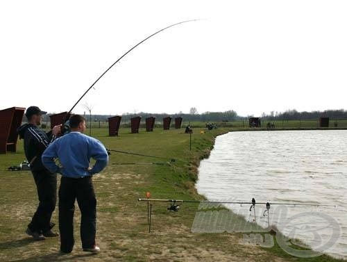 Elindultunk a csónakkal lebójázni, kiválasztani az optimális helyet. Akkor abban a tudatban voltunk, hogy a kemény részt kell keresni, ugyanis ott eszik, ott jár a hal. Ez valóban így is van, de a legjobb hely a kemény és az iszapos aljzat találkozása. Igaz, a legutóbbi versenyen erre is rácáfolt a román csapat, ugyanis ők kb. 110 méterre az egyenletes, 40 cm-es iszapmezőn horgásztak – sikerrel. Próbáltunk kemény területet keresni, de egyszerűen nem találtunk 50 cm-nél kevesebb iszapot. Nem akartuk elhinni. Ilyen nincs. Ott köröztünk, mint két szédült „kemotoxos” légy. Meg is kérdezte a szomszéd, hogy csónakázni vagy versenyezni jöttünk. Nem láttunk az idegtől. Majd – jobb híján – lebójáztunk két olyan helyre, ahol kb. 30 cm-es iszap volt. Ez nagyon messze volt attól, amilyen helyet elméletünk alapján kerestünk. Mindegy, ez van. Azt a taktikát választottuk, hogy kevés bojli szórása mellett rengeteg apró maggal és pellettel próbáljuk meg „kifürdetni” a helyet a kisebb halakkal. Egyik bójánál a Squid & Octopus, a másiknál az M1 bojli volt a horgon. Elindult a verseny. Egy nap elteltével még nem fogtunk halat. Az vigasztalt, hogy rajtunk kívül még másik kilenc csapat sem fogott. Ez persze rossz szemlélet, ugyanis a versenyen sosem azt kell figyelni, hogy ki nem fogott, hanem azt, hogy én hogyan foghatnék még többet! No mindegy.